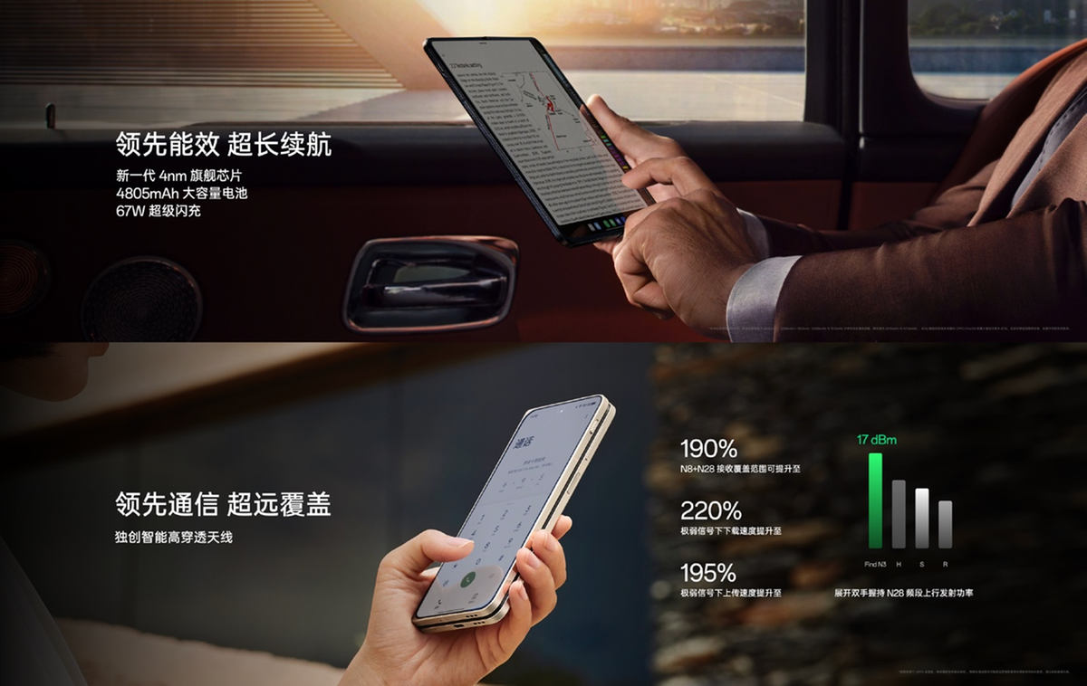 即便拥有着轻薄机身设计,OPPO Find N3依然具备4805mAh大容量电池的加持,配合4nm旗舰芯片的优秀能耗以及67W超级闪充加持,可为用户带来可靠的长续航体验。另外,新机还采用独创的智能高穿透天线,有效提升信号接收覆盖范围以及5G弱网下的信号以及网速表现。外放方面,OPPO Find N3还首次集成了超临境扬声器系统,也是目前唯一支持外放空间音频的折叠屏手机。